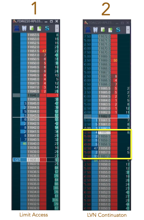 Down below we can see the price ladder for the DAX. As we are approaching the key level for a break, the rotations up and down look good. As we are breaking through 38, the steady rotations are presenting us with a first option on how to access this market. That is by placing our limit order at 38 and waiting for a rotation to come back to fill us. Unfortunately in this case market does not provide us a chance to get back on the move, leaving the first LVN zone behind us. If this was your only option to get on the move, you might get frustrated and angry from missing the entire move. If you had more access strategies (like the one we are using in our price ladder course), you could have been patient and observe the market further. As the market progressed higher, STOXX also confirming the move higher, DAX has created another push and created something that we call LVN (Low Volume Node) Continuation type of access (2, yellow square down below). The idea behind this type of access is that market should not get back and fill the LVN zone. Your risk is clearly defined below the LVN zone. As the LVN zone has been created, we can also see 40lots chasing the market that can give us an additional bit of conviction to get aggressively on this move.
