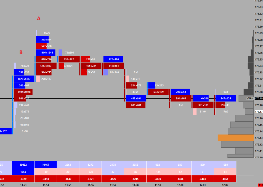 Here the market bid all the way until only 25 lots lifted the offer at the high, but the buyers never swept the price to lift the next price, leaving (0x25) on the footprint. Likewise, an ‘unfinished auction’ can be seen at point B where both the bid and offer were hit at that price (76×225) once the buyers swept the price and then stacked the bid at that price.
