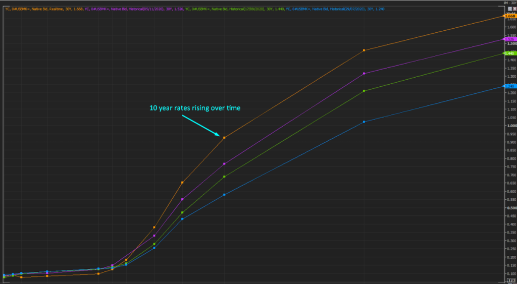 - Yield curve is steepening – meaning borrowing costs for consumers which are tied to longer end rates are getting more expensive