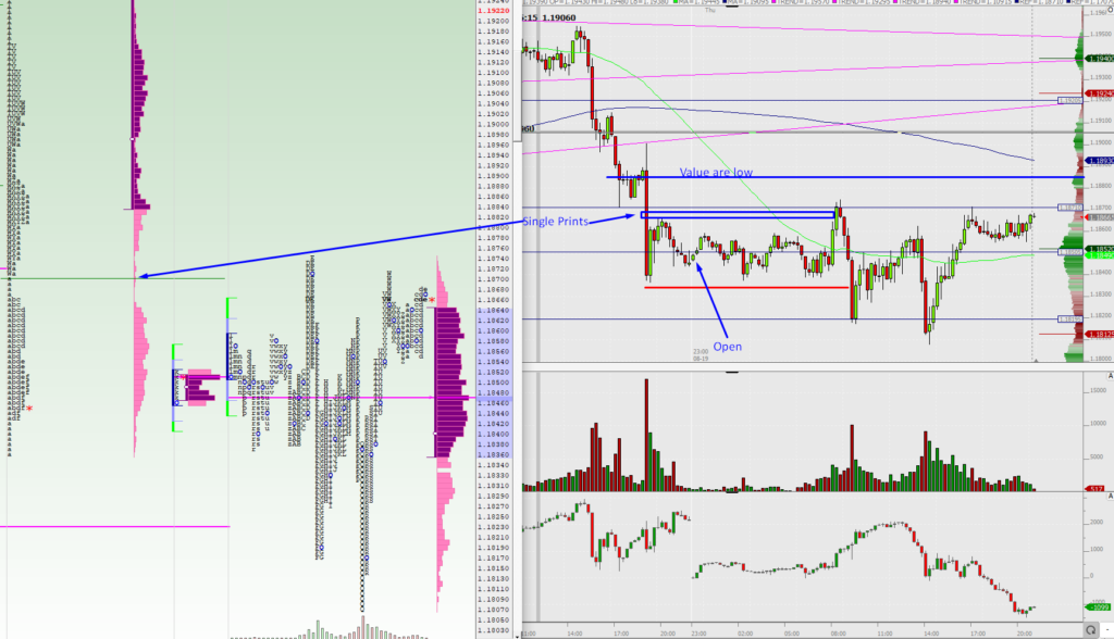- Are there any hurdles along the route back to value? These will need to be factored in to your trading strategy. In the example above, a set of single prints are visible between 1.1867-1.1870, the accompanying low volume at price indicates a point where sellers gained control and can be assumed to come back in at those prices. So, part of your trade strategy has to take account of this and can give an opportunity to scale out of position unless clear buying is seen through the single prints.