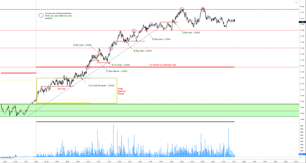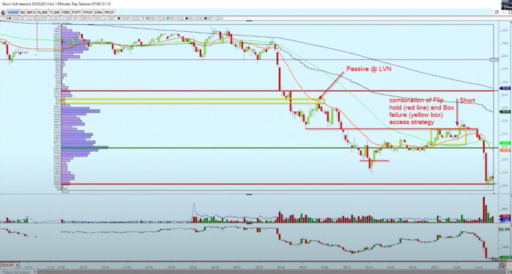 The same set of strategies we can apply in the trade explained in the video at the beginning of the article describing the trend day. Specifically the Box failure, Flip hold and LVN access strategies.