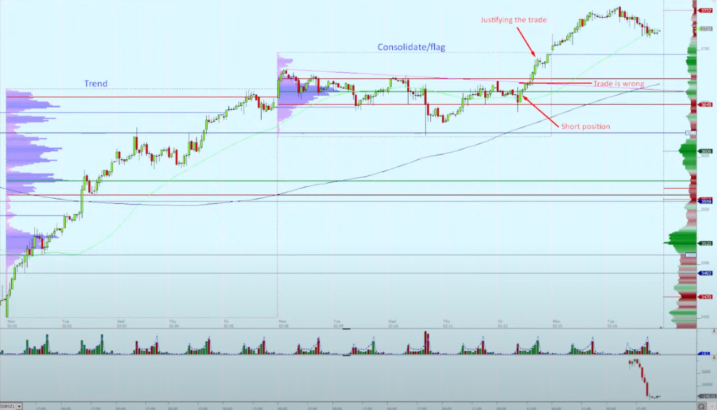 In the example below, we have a similar example but a trigger might be different. In this case, the trader still believes that he/she might be still right with short position although all the market-generated information is screaming that the trade has been invalidated. Unlike in our first example, the discomfort our ego is trying to avoid in this case is not to be wrong on a trade and therefore does everything possible to justify staying in a trade “a bit longer”.
