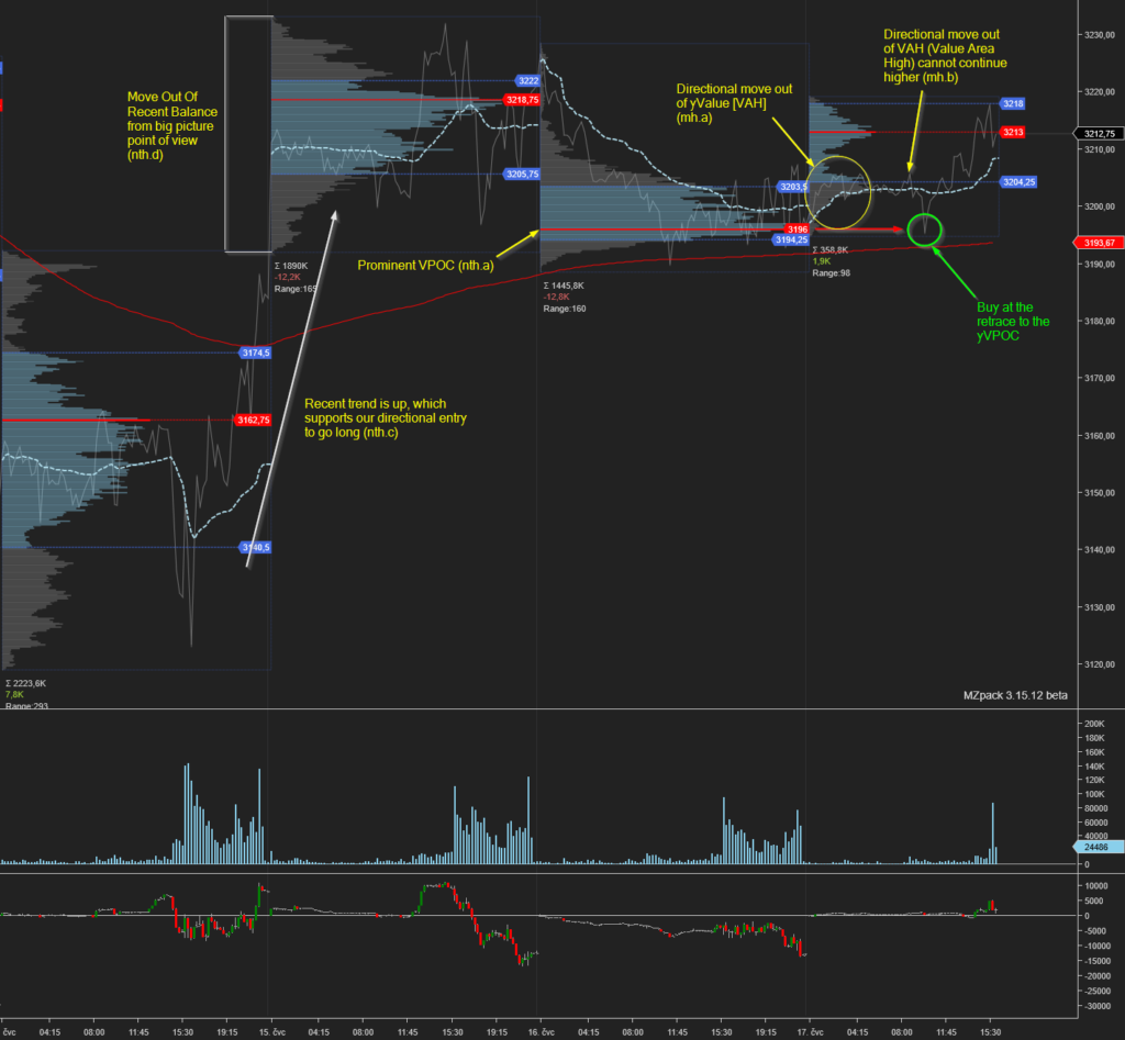The market made a trend move (nth.c – check) and made a move out of recent balance (nth.d – check). Then balanced for two days, and in day two created a prominent VPOC (nth.a – check). Then on the day of our trade, we have created directional move out of yesterday’s value (mh.a – check). This move was not sustained and there was no follow through with momentum (mh.b – check). This lack of momentum created a move back towards our point of entry, our VPOC. VPOC then produced a great entry point for our trade and should be managed according to trade management strategy, something we will not cover in this article, but you can check one trade management strategy that you can potentially apply.