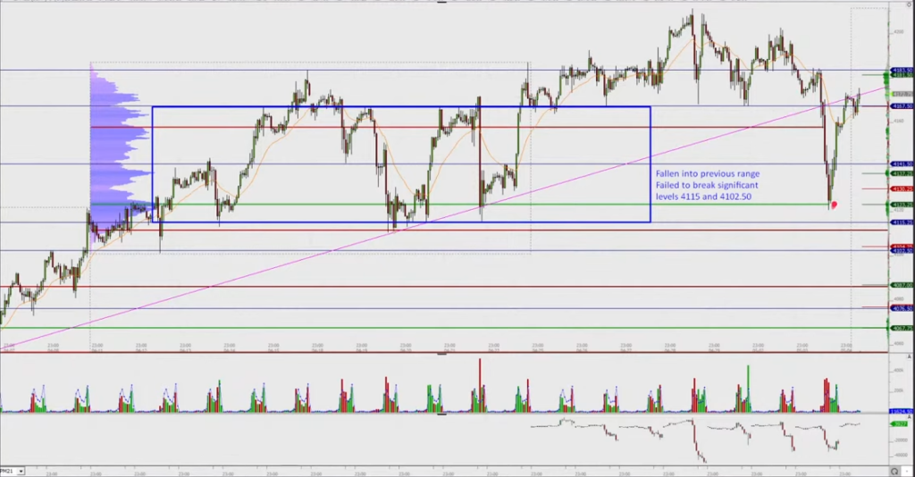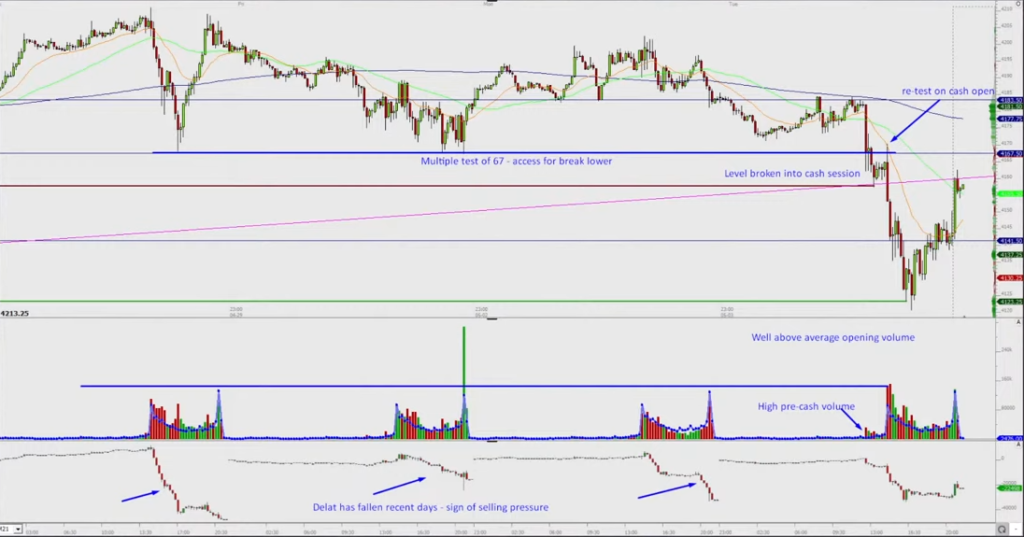 Down below we can see a chart of Spoo (E-MINI S&P500). Spoo over time has created a vulnerable low at 67 level while creating a very balanced, mature structure. With lower highs leading into the break, we have a vulnerable structure in the bullish context. This can give us a clue, that we should expect a liquidation type of move rather than a change in the bigger picture trend. This information can adjust our target expectations. Given the break of 67 level, this becomes our line in the sand. The break has occurred 2 hours prior to US cash open on higher than average volume. Once the US cash open failed to produce a bullish open drive, the market started to offer heavily. This was our trading opportunity with well-defined risk and expectations for the target.