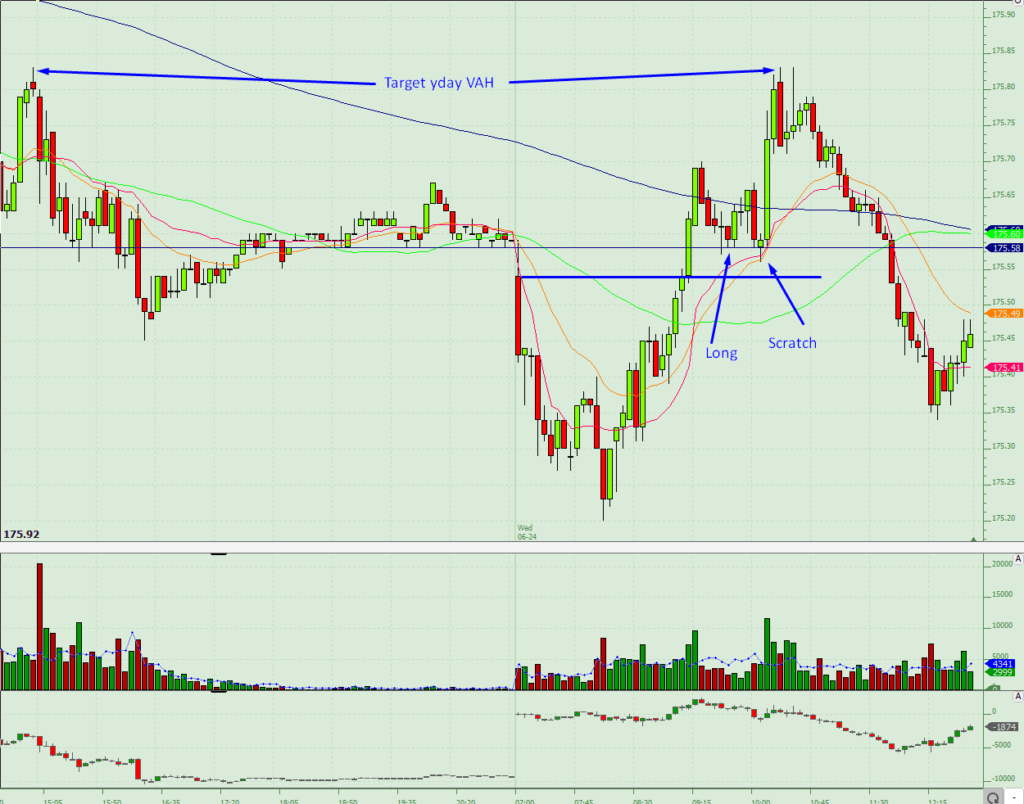 This is a very common question, along with when can I move my stop to scratch? that I receive during our Career Trading Course as well as from traders that I mentor. It is a rare occasion that a stop can be moved to scratch/break-even; the motivation to do so is based on trying to protect profit and not take a loss after having been on side, it fact often what it serves to do is limit profit when you are right whilst not doing anything to protect you when you are wrong. Meaning that over time many trades that could be a winner are cut at precisely the worst point. Take for example the trade below which was discussed in the Daily Debrief. The aim of the trade was that whilst above the open (blue line) then a move to yesterday’s value are high was on – entering on a pull back with stop below the open would be the initial trade plan but having gone on side many trade will want to ‘protect’ themselves by bring in the stop to scratch – this gets you out of the trade with out being proved wrong but arguably more damaging is fact that talking a scratch has guaranteed not taking any potential profit.